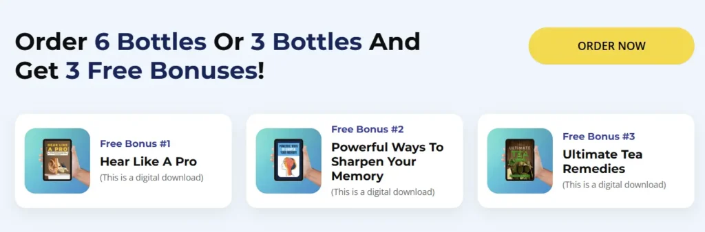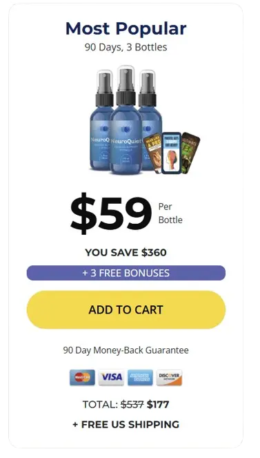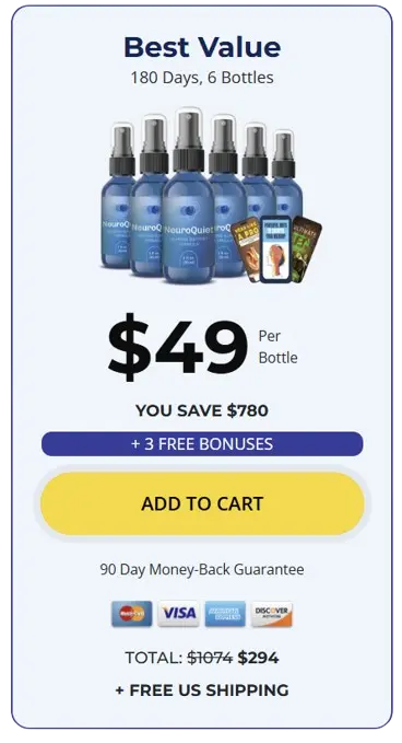 When you purchase NeuroQuiet bundle packages, you not only get discounted pricing but also receive free bonus materials. The 3-bottle and 6-bottle packages come with 3 Exclusive Bonuses, making the offer even more valuable.